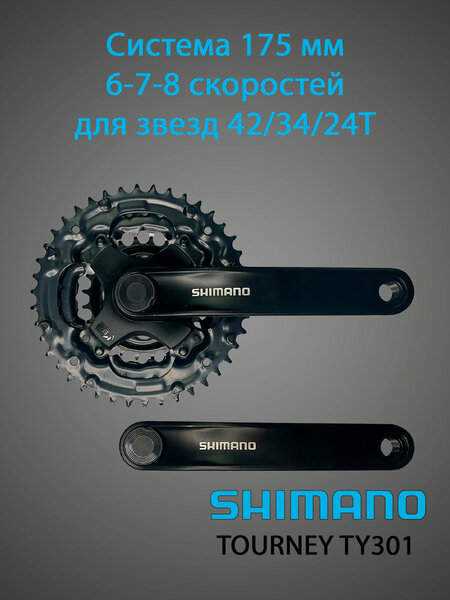 Система SHIMANO TOURNEY TY301 - это недорогая система базового уровня от японского производителя комплектующих и запчастей. Tourney TY301 под квадрат для велосипедов с трансмиссией 3х6/7/8 скоростей идеально подходит для городского катания и прогулочного катания по пересеченной местности. • Тип крепления: квадрат • Длина шатунов: 175 мм • Кол-во звезд: 3 • Без защиты • Количество передач: 3х6/7/8 • Набор звезд: 42/34/24 • Материал шатунов: алюминий • Материал звезд: сталь • Вес: 925 г • Цвет: чёрный