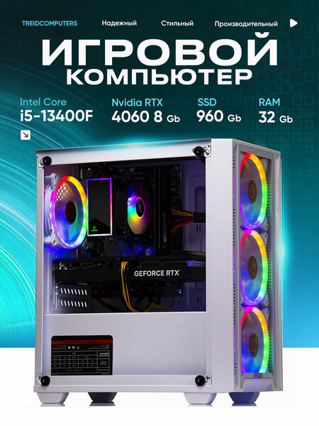 Системный блок ПК Игровой Компьютер TREIDCOMPUTERS (i5 13400f 2,5 Ghz (10 ядер) / 32 Гб / SSD 960 Gb / GeForce RTX 4060 8 Gb) Мощный процессор Intel Core i5-13400F с частотой 2,5 Ghz и 10 ядрами обеспечивает быструю и стабильную работу системы. 32 ГБ оперативной памяти DDR4 с частотой 2666 MHz позволяют быстро обрабатывать большие объемы данных и запускать ресурсоемкие приложения. SSD объемом 960 ГБ обеспечивает быстрый запуск операционной системы и программ, а также хранение большого количества данных. Дискретная видеокарта NVIDIA GeForce RTX 4060 с 8 ГБ видеопамяти позволяет наслаждаться качественной графикой и высокой детализацией изображения в играх и при работе с графическими приложениями. Системный блок поставляется с предустановленной операционной системой Windows 10 Pro, что обеспечивает удобство и быстроту настройки. Корпус Midi-Tower выполнен в белом цвете и оснащен яркой RGB подсветкой, которая придает компьютеру стильный и современный вид. В комплекте с системным блоком идет кабель питания и персональный менеджер, который поможет решить любые вопросы и проблемы, связанные с компьютером. Выбирая системный блок ПК Игровой Компьютер TREIDCOMPUTERS, вы получаете мощный, стильный и функциональный компьютер, который станет отличным выбором для геймеров и профессионалов в области графики.