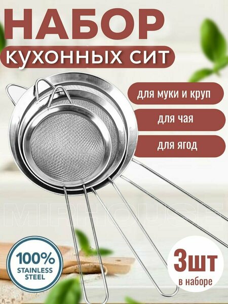 Набор из трех сит из нержавеющей стали диаметром 6,5-8-10 см. Универсальный размер для большинства применений. Подходит для просеивания муки и творога, процеживания напитков, промывания фруктов, экстрагирования чая и кофе. Прочная стальная сетка и корпус обеспечивают износостойкость и долговечность изделия. Подходят для мытья в посудомоечной машине и занимают мало места. Сита- это кухонная утварь, используемая для просеивания муки, сахара и других сыпучих продуктов. Они помогают удалить комочки и ненужные частицы и придать продуктам более ровную текстуру.