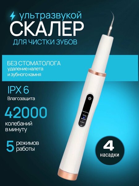 Скалер ультразвуковой skaler - это незаменимый инструмент для ухода за полостью рта. Он предназначен для удаления зубного камня и чистки зубов, обеспечивая профессиональный результат в домашних условиях. Скалер работает от аккумулятора, что позволяет использовать его в любом месте и в любое время. Время автономной работы составляет 60 минут, что достаточно для выполнения большинства задач по уходу за зубами. Скалер оснащен 4 насадками, которые подходят для взрослых и детей. В комплекте также идет ключ для насадок и провод для зарядного устройства. Скалер имеет 5 режимов работы, что позволяет выбрать наиболее подходящий для ваших нужд. Скалер ультразвуковой skaler имеет белый цвет и оснащен дисплеем и индикатором зарядки. Это делает его использование удобным и простым. Вес скалера составляет всего 250 грамм, что делает его легким и удобным для использования. В целом, ультразвуковой скалер skaler - это надежный и удобный инструмент для ухода за полостью рта, который поможет вам поддерживать здоровье зубов и десен.