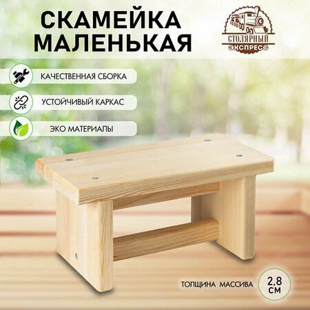 Скамейка маленькая - отличный помощник! На ней можно не только сидеть , но и встать на нее чтобы дотянуться до высокого шкафа или полки . Важными преимуществами нашей скамейки являются: ✅ надежная конструкция ✅ компактные размеры ✅ качественная сборка ✅ экологичные материалы Скамейка изготовлена из мебельного щита хвойных пород дерева (сорт ЭКСТРА), толщина массива 2,8 см. Размеры скамейки: В-19,5 см Д-39,5 см Ш-19,5 см Сборка скамейки осуществляется в ручную с использованием мебельных болтов саморезов большой длинны. Подобная крепежная фарнитура не дает скамейке расшататься даже при очень агрессивной эксплуатации, а столярный клей делает изделие «неубиваемым». Скамейка тщательно отшлифована ручным способом. Поставляется в собранном виде. СТОЛЯРНЫЙ ЭКСПРЕСС дорожит своей репутацией и предлагает Вам только качественные изделия, которые прошли большой путь от разроботки и расчетов до конечного изделия