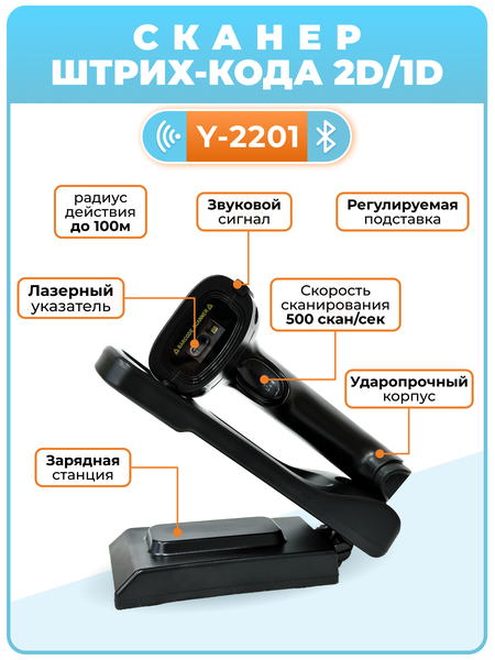 Беспроводной сканер штрих-кода Y-2201W2D, c регулируемой базой-подставкой для зарядки читает коды 1D и 2D со всех поверхностей, включая экраны мобильных устройств и компьютера. Работает на удалении до 100 метров от рабочего места в течение 10 часов. Удобно держать в руке; Удобно ставить на зарядку; Выдерживает падение с двух метров; Не требует установки драйверов и ПО; Беспроводное соединение 2.4G (База-подставка) - до 100 метров; Bluetooth - до 50 метров; Совместим с Windows, Android, iOS; Заряд батареи: 2600mAh Протестирован для работы с маркировкой, ЕГАИС, Честный знак, фгис (учет алкогольной и табачной продукции). QR-код, DataMatrix. Работает с 1С. Каждый экземпляр тестируется для работы с маркировкой (Честный знак). Отлично подходит для всех ПВЗ. Возможно подключение к ПК или кассе через USB ресивер (протестированная уверенная дальность приема в пределах видимости - 100 метров), а также через bluetooth соединение напрямую к ПК, кассе. Работает с кассовыми аппаратами Эвотор, АТОЛ, МТС и другие. Если в оборудовании имеется поиск устройств bluetooth, возможно подключение напрямую без USB ресивера (базы-подставки) в режиме HID. Варианты использования: ПВЗ Озон; ПВЗ других магазинов; Автоматизация складов; Автоматизация аптек; Документооборот. Проверено для работы различных конфигураций 1С: Управление торговлей; УПП; Розница; УНФ; Комплексная автоматизация и др.