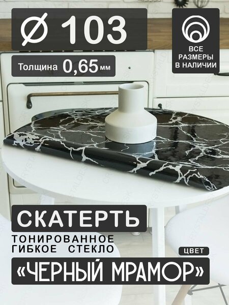 Круглое гибкое стекло CrystalDesk – это плотная клеенка 0,65 мм толщиной на круглый кухонный стол в стильном цвете "Чёрный мрамор". Чёрная, тонированная и эластичная, благодаря чему получила название жидкое стекло или мрамор. Пленка защитит круглый деревянный стол от загрязнений, царапин, потертостей и прорезов. Наша пленка плотно ложится на поверхность столешницы и преображает весь дизайн, а самое главное, гораздо прочнее и долговечнее – она защитит круглый деревянный стол от загрязнений, царапин, потертостей и прорезов или скроет уже существующие потертости поверхности. Чёрное гибкое стекло прекрасно впишется в любой дизайн и станет элементом декора, добавляя легкий глянцевый оттенок и стильный рисунок мрамора. Прожилки выполнены из серебристых блесток, а основа скатерти - чёрное тонированное гибкое стекло, то есть полотно немного прозрачно. С помощью гибкого стекла Вы с легкостью преобразите внешний вид Вашего стола или иной поверхности без необходимости замены самой мебели! Влагостойкая и моющаяся, за ней легко ухаживать: не нужно стирать, достаточно протереть мягким полотенцем - ни жидкости, ни грязь не впитываются. Эластичную плёнку легко постелить. Незаменима на торжествах, новогодних и пасхальных мероприятиях. Покрытие из этого материала не скользит, а посуда крепко на ней держится. При желании, можно свернуть в рулон и безопасно хранить. Подходит на кухню, офис, рабочий или журнальный стол, школьную парту, а так же дачу и садовую мебель. Обращаем Ваше внимание, что накладка не термостойкая, а максимальная температура до +65 градусов. Используемый при изготовлении материал ПВХ соответствует ГОСТ и имеет декларацию соответствия. Поставляется в рулоне. Для заказа Вам необходимо выбрать фактический диаметр столешницы в сантиметрах. При изготовлении будет заложен технологический запас клеенки на одной из сторон, по которой происходит усадка. После срока усадки (около 4 недель со дня изготовления) она самостоятельно скорректируется к заявленному. Использовать можно с первого дня после получения. Если Вы получили жидкое стекло точно в заявленный в заказе размер (без запаса), не переживайте - это означает, что срок усадки уже прошел. Подойдет для овальных форм, для этого выбирается большой диаметр для закрытия всей площади со свисанием краев. Важно: для стеклянных и столов с глянцевой поверхностью (включая белые) - используйте матовое рифленое жидкое стекло. Для укладки потребуется ровно расстелить заворачивающимися краями вниз. Обязательно прочтите комплектную инструкцию до начала эксплуатации. Полотно может иметь остаточные деформации после транспортировки и хранения. После транспортировки, распаковать и от 24 до 48 часов можно оставить отлежаться в расправленном виде, чтобы все складки, "волны" и изгибы расправились. Защитное мягкое стекло имеет внешнее сходство с силиконовой, оно не клеится, не фиксируется, не требует дополнительного монтажа. При эксплуатации может возникнуть желание корректировки размера или формы. Это можно сделать в домашних условиях. Понадобится: фломастер на водной основе для разметки или шариковая ручка, канцелярский нож для основной корректировки и острые ножницы для работы с краями (например, закругленных углов). Данную процедуру необходимо производить после усадки. Изготовлена из многос