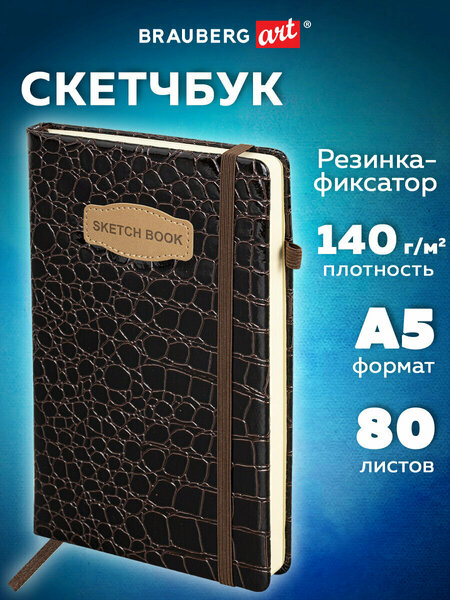 Откройте для себя идеальный скетчбук BRAUBERG ART "CLASSIC", который станет вашим верным спутником в мире творчества! Этот утонченный блокнот с обложкой, стилизованной под кожу крокодила, создан для всех, кто любит рисовать и делать записей. Внутренний блок из 80 листов белой художественной бумаги плотностью 140 г/м2 идеально подходит для различных графических материалов – от карандашей до линеров. Компактный и легкий, этот скетчбук удобно носить с собой, а жесткая обложка обеспечит надежную опору для рисования на ходу. Эластичная резинка надежно держит блокнот закрытым, а закладка-ляссе поможет быстро найти нужную страницу. На задней обложке предусмотрен карман для мелочей, что делает его функциональным помощником для студентов, художников и дизайнеров. Не упустите шанс приобрести этот стильный и практичный блокнот для записей, который вдохновит вас на новые творческие достижения! • Тип товара: скетчбук CROCO. • Серия: Classic. • Вид работ: для зарисовок, эскизов, рисования. • Количество листов: 80. • Формат: А5. • Ширина: 130 мм. • Длина: 210 мм. • Дизайн: под крокодила. • Обложка: твердый переплет. • Внутренний блок: художественная бумага. • Цвет внутреннего блока: слоновая кость. • Плотность внутреннего блока: 140 г/м2. • Жесткая подложка: да. • Тип скрепления: книжный переплет. • Без кислот: да. • Цвет обложки: коричневый. • Индивидуальная упаковка: да. • Артикул производителя: 116471.