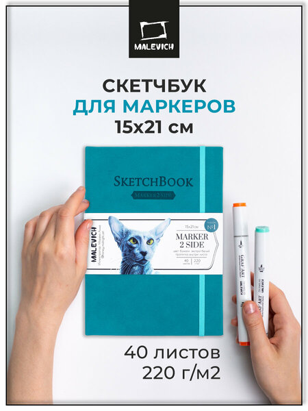 Скетчбук Малевичъ для маркеров: двусторонняя бумага и функциональность Скетчбук Малевичъ для маркеров представляет собой специализированную серию для рисования спиртовыми маркерами. Бумага имеет специальный слой, который не пропускает чернила на обратную сторону, позволяя рисовать с обеих сторон. Блок скетчбука содержит 40 листов (80 страниц) с плотностью бумаги 220 г/м. Формат A5, длина 21 см и ширина 15 см, что делает его удобным для переноски и использования в любом месте. Обложка скетчбука выполнена из искусственной замши, что придает ему стильный и современный вид. Скетчбук закрывается на резинку, обеспечивая надежное хранение ваших рисунков. Бумага имеет гладкую фактуру и белый цвет. Скетчбук Малевичъ для маркеров - это отличный выбор для тех, кто ценит качество, функциональность и стиль в одном продукте.