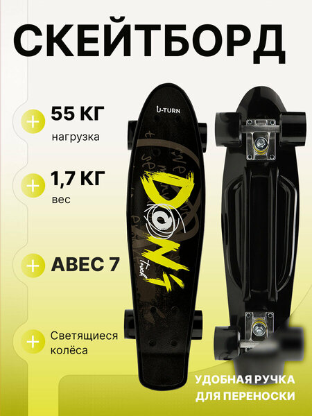 Скейтборд-Пенниборд U-TURN: активный отдых для детей и подростков Пенниборд изготовлен из прочного пластика и алюминия, что обеспечивает долговечность и надежность в использовании. Светящиеся колеса из полиуретана (PU) с жесткостью 82 A - обеспечивают отличное сцепление с поверхностью и устойчивость на дороге. Черный цвет скейтборда декорирован модным рисунком с надписью "Dont", что делает его привлекательным для подростков. Упаковка: термоусадочная и пузырчатая пленка обеспечивает надежную защиту скейтборда от повреждений во время транспортировки. Выбирайте скейтборд для активного отдыха и наслаждайтесь катанием на свежем воздухе с друзьями и семьей.