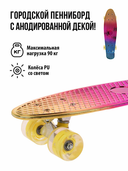 Скейтбординг – это не только весёлый досуг! Это настоящее спортивное увлечение, занятие которым поспособствует развитию всех групп мышц и улучшению координации движений. Осваивая скейтборд, ребёнок может начать с простого катания, а потом, постепенно, осваивать различные трюки, от простых к сложным. Таким образом, каждое занятие скейтбордингом будет сопровождаться всё новыми и новыми спортивными достижениями!Модель пенниборда от торговой марки X-match отличается не только привлекательным дизайном, но и высокой практичностью благодаря анодированной деке. Анодирование представляет собой процесс создания оксидной плёнки, которая повышает стойкость поверхности изделия к износу и, соответственно, существенно увеличивает его срок службы. Характеристики - Размер деки 56,5х14,5 см; - Алюминиевая подвеска; - Мягкие и прочные PU колёса 5,6 мм. со светом;- Подшипники авес 7;- Максимальная нагрузка: 90 кг.