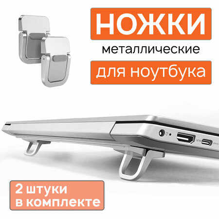 Металлические складные ножки серебряного цвета для ноутбука, клавиатуры, планшета и т. д, в комплекте 2 штуки. Ножки, установленные на дальний край, поднимают ноутбук или клавиатуру на комфортный угол(12-13 градусов):