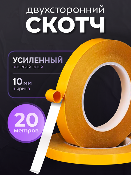 Двухсторонняя клейкая лента тонкая. Нельзя использовать для приклеивания москитной сетки. Ширина ленты 10 мм, намотка рулона 20 метров, в комплекте 1 ролик. Двусторонний скотч - идеальное решение для дома и офиса. Эта клейкая лента имеет множество применений. Благодаря своей двусторонней высокой клеящей способности, она становится незаменимым инструментом в различных сферах деятельности. Прочный, крепкий и липкий, этот продукт подходит практически для любого материала. Крепежный скотч отлично подходит для декораций и украшений. Его декоративный потенциал помогает создавать оригинальные поделки и подарки. Антистресс-шарики или игрушки также легко фиксируются при помощи этой универсальной ленты, что делает творческий процесс легче и интереснее. В канцелярии без этого скотча не обойтись. Канцелярские принадлежности всегда будут под рукой, а документы надёжно зафиксированы. Фиксация фотографий на стенах или сборка картин для выставок занимает меньше времени и усилий, оставляя больше времени на творчество. Рукоделие с использованием этой ленты станет ещё увлекательнее. Легкость использования позволяет быстро создавать красивые поделки. Незаметные швы обеспечивают аккуратный внешний вид готовых работ. Среди прочих достоинств нельзя не отметить отсутствие следов после отклеивания. Это важное преимущество многим облегчит жизнь, особенно тем, кто часто меняет оформление интерьера или любит перестановки. Используйте этот продукт в качестве фиксатора украшений на праздники или чтобы сделать оригинальный подарок близким. Подарочная упаковка станет настоящим произведением искусства! Этот товар поможет в любом деле – от заклейки конвертов до полноценного ремонта дома. Легкость в использовании делает его отличным выбором даже для детей – безопасная липучка не причинит вреда маленьким ручкам.