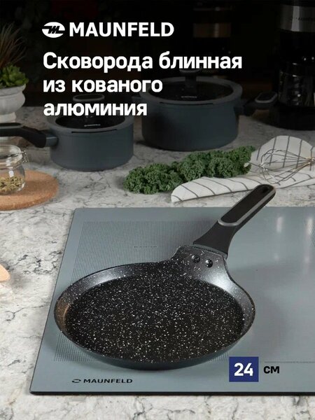 Сковорода блинная из кованого алюминия MAUNFELD FRIDA диаметром 24 см, толщиной стенок 3 мм и дна 3 мм. Высота стенок 1,7 см. MAUNFELD - известный бренд, который себя зарекомендовал как производитель высококачественных кухонных приборов. Бренд FRIDA - это линейка профессиональной посуды из литого алюминия с антипригарным покрытием из натурального мрамора. Сковорода подойдет для всех типов плит, включая индукционные. Она имеет удобную профессиональную удлиненную ручку soft touch, что делает ее удобной и безопасной в использовании. Сковорода имеет толстую стенку, которая обеспечивает равномерное распределение тепла и предотвращает пригорание пищи. Также она имеет термостойкое покрытие оригинального графитового цвета, которое защищает от царапин и сколов. Антипригарное мраморное покрытие позволяет готовить без использования масла, что делает пищу более здоровой и уменьшает количество жира. Сковороду можно мыть в посудомоечной машине, что облегчает уход за ней. В целом, сковорода MAUNFELD FRIDA - отличный выбор для тех, кто ценит качество и комфорт при приготовлении пищи.