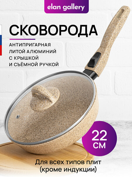 Глубокая сковорода Elan Gallery "Медовый гранит" с крышкой и съёмной ручкой из серии "Гармония вкуса" диаметром 22 см равномерно разогревается и распределяет тепло, поэтому продукты в ней сохраняют полезные свойства и сочность. Диаметр дна — 16 см. Стильный дизайн подойдет к любому интерьеру кухни. Подходит для приготовления стейков из рыбы, мяса или блюд из овощей. Сковорода с глубоким дном выполнена из толстостенного литого алюминия и имеет ультрапрочное двухслойное антипригарное покрытие Cookmark. Оно устойчиво к царапинам и износу, безопасно для здоровья и не содержит PFOA или других вредных веществ. Используйте для жарки котлет или картофеля с минимальным количеством масла. Здоровую пищу оценит любой гурман! Готовьте на завтрак оладьи или блюда из яиц: яичницу, омлет. Порадуйте близких большой порцией блинов на Масленицу, ни один блинчик не подгорит. Алюминиевая сковородка с толстым дном имеет удобную ручку, которая обеспечивает надежный захват при подаче еды с плиты на стол. Без крышки и ручки можно использовать в духовом шкафу как форму для запекания при температуре до 250°C. Не использовать съёмную ручку, чтобы достать раскалённую сковороду из духовой печи! Приготовьте румяную курочку в духовке и порадуйте своих близких. Эксплуатация: не нагревать без продуктов. Дайте посуде остыть, прежде чем помещать ее в воду. Использовать только деревянные, силиконовые и пластиковые лопатки без острых краёв. Не мыть абразивными или щелочными моющими средствами. Использовать в ПММ в режиме "Эко" со средством, не содержащим щёлочи. Подходит для стеклокерамических, газовых и электрических плит. Не подходит для индукционных плит. Кухонная утварь станет приятным подарком для женщин на День Рождения, 8 Марта и придаст процессу приготовления пищи комфорта. Подарите универсальную вещь маме, подруге, сестре или бабушке. Хорошая сковорода – мечта любой хозяйки! Сковородка станет незаменимым инвентарем на вашей кухне и наполнит процесс приготовления пищи удовольствием!