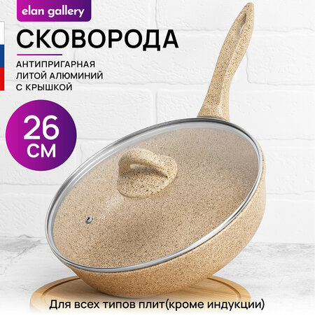 Глубокая сковорода Elan Gallery "Медовый гранит" из серии "Гармония вкуса" диаметром 26 см с крышкой равномерно разогревается и распределяет тепло таким образом, что продукты в ней сохраняют свои полезные свойства, сочность и вкус. Диаметр дна сковороды — 18 см. Стильный мраморный дизайн подойдет к любому интерьеру вашей кухни. Сковорода с глубоким дном выполнена из толстостенного литого алюминия и имеет ультрапрочное двухслойное антипригарное покрытие Cookmark. Оно устойчиво к царапинам и износу, полностью безопасно для здоровья и не содержит PFOA или других вредных веществ. Сковороду можно использовать для жарки с минимальным количеством масла для приготовления здоровой пищи, что оценит любой гурман. Готовьте дома любимые стейки, они сохранят свою сочность, нежность и аромат! Сковорода подходит для приготовления блюд из рыбы, мяса, овощей, а также плова. Сковородка станет идеальным помощником для создания завтрака, например: яичницы, омлета, блинов, оладий. Имеет удобную ручку, что обеспечивает надежный захват при подаче еды с плиты на стол. Стеклянная крышка позволит сохранить тепло блюда, защитит от брызг, а также поможет следить за процессом приготовления пищи. Эксплуатация: не нагревать без продуктов. Дайте посуде остыть, прежде чем помещать ее в воду. Использовать только деревянные, силиконовые и пластиковые лопатки без острых краёв. Не мыть абразивными или щелочными моющими средствами. Использовать в посудомоечной машине только в режиме "Эко" с использованием средств, не содержащих щелочи. Подходит для всех типов плит, кроме индукционных. Сковорода станет идеальным подарком для женщин и придаст процессу приготовления пищи новый уровень комфорта. Подарите такую универсальную вещь маме, подруге, сестре или тёте. Хорошая сковорода – мечта любой хозяйки!