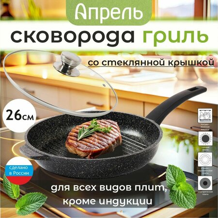 Литая сковорода гриль, сковородка 26 см с антипригарным покрытием и с несъемной ручкой, со стеклянной крышкой с ручкой из нержавеющей стали. Сковорода гриль ТМ Апрель. Цвет: черный. Диаметр: 26 см. Диаметр дна: 22,7 см. Высота: 5 см. Толщина стенки: 3,8 мм. Толщина дна: 4,5 мм. Крышка из термостойкого стекла в комплекте. Подходит для всех типов плит, кроме индукционных. Можно использовать в посудомоечной машине. Гриль - незаменим на кухне, особенно для приготовления мяса, рыбных стейков, котлет, птицы. Сверхпрочное антипригарное покрытие отличается особой износостойкостью и превосходными антипригарными свойствами. Также в продаже имеются сковороды 22, 24, 26, 28 см. Набор сковородок станет надежным помощником на вашей кухне. Сковорода блинная поможет в приготовлении блинчиков, сковорода-гриль приготовить стейк. Посуда для кухни, посуда для приготовления, кухонная утварь. Отличный подарок на любой праздник.