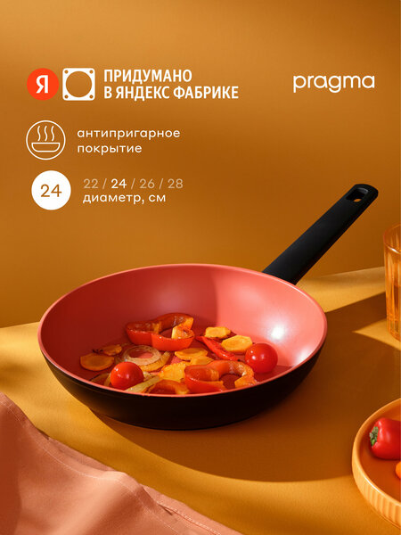 Pragma — это бренд эстетичных и функциональных решений для дома, придуманный в Яндекс Фабрике. Сковорода Pragma Rengan сделана из лёгкого и прочного алюминия. Двухслойное антипригарное покрытие PFLUON не выделяет вредных веществ при нагревании. В сковороде можно обжаривать и тушить мясо и рыбу, пассеровать овощи. Специальное покрытие защищает от пригорания — достаточно добавить немного масла при готовке. Удобная ручка из бакелита с покрытием Soft Touch не скользит в руке и не нагревается. Контрастное сочетание цветов делает сковороду заметной деталью в интерьере кухни. Практичная сковорода Pragma Rengan подходит для индукционной и других типов плит. Её можно мыть в посудомоечной машине: индукционный диск не испортится во время мытья.