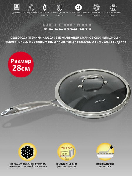 Сковорода премиум-класса из нержавеющей стали высочайшего качества, с 3-слойным дном и инновационным антипригарным покрытием с рельефным рисунком в виде сот. Её легко мыть и при готовке можно пользоваться металлическими кухонными принадлежностями! Сочетание уникальных технологий позволяет готовить без добавления большего количества масла и при пониженной температуре. В результате, пища более здоровая и содержит меньше калорий. Это гибридная сковорода, поэтому по мере приготовления она будет работать все лучше и лучше. аналогично чугунной сковороде. Сковорода VELERCART при правильном использовании прослужит долгие годы! Сковорода соответствует всем необходимым требованиям и стандартам качества.
