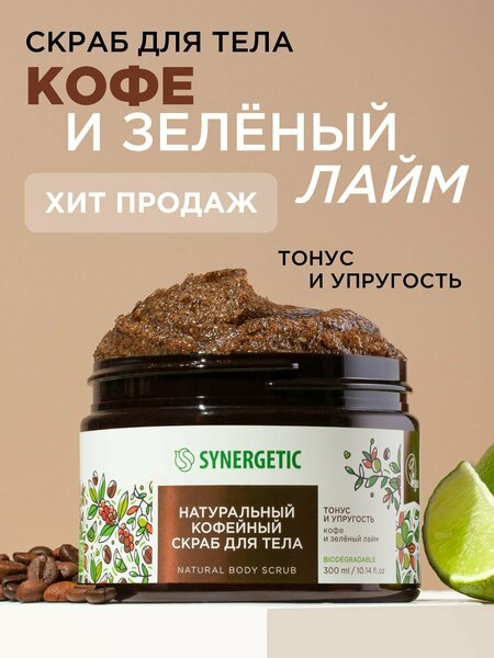 Натуральный кофейный скраб для тела SYNERGETIC тонус и упругость "Кофе и зеленый лайм" - это эффективное средство для ухода за кожей, более чем на 99% состоящее из натуральных компонентов. Скраб деликатно отшелушивает и очищает кожу. Масло кокоса в сочетании с молотым кофе интенсивно тонизируют и придают упругость, а масло карите питает и увлажняет, делая кожу гладкой и бархатистой. Масло миндаля и экстракт лайма интенсивно увлажняют нежную кожу, придавая мягкость и упругость. Гипоаллергенная парфюмерная композиция разработана в швейцарском доме Givaudan, где уже более ста лет создают ароматы, которые используются во всем мире в парфюмерии и косметике. Парфюмерная композиция натурального кофейного скраба для тела с нотами лайма, кофе, ореха и карамели оставляет на коже изысканный аромат. Средство не содержит SLS, SLES, парабенов, силиконов, минеральных масел и красителей, а также компонентов животного происхождения, не тестируется на животных и сертифицировано британской организацией The Vegan Society. Знак Vegan - мировой стандарт этичной продукции.