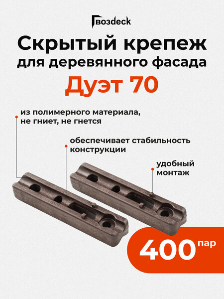 Скрытый крепеж Гвозdeck Дуэт 70 является идеальным выбором для надежной и незаметной фиксации различных конструкций. Этот перфорированный крепеж включает в себя 400 пар крепежных элементов, что обеспечивает высокую эффективность и заметное сокращение времени на монтаж. Каждая пара состоит из двух прочных пластин, которые гарантируют стабильную соединение и отличную поддержку для ваших проектов. Скрытый крепежный элемент Гвозdeck дуэт 70 предназначен для монтажа досок любой формы, имеет гладкую поверхность без острых режущих кромок, прост в монтаже и не требует обслуживания в процессе эксплуатации. Для удобства монтажа первой доски используется стартовый дуэт. Данный крепежный элемент обеспечивает требуемую надежность конструкции, фактически невидим. Применение: монтаж планкена прямого, монтаж планкена скошенного (ромб), монтаж имитации бруса, монтаж блок-хауса. Максимальная нагрузка: 100 кг. Преимущества: -Выполнен из композиционного полимерного материала и не конденсирует влагу; -Обеспечивает долговечность фасада благодаря эффективной вентиляции тыльной стороны обшивочной доски; -Состоит из двух соединительных независимых элементов и предназначен для монтажа досок на вертикальных и потолочных конструкциях; -Не требует антикоррозионной защиты; -Удобен для монтажа, так как снабжен монтажным ограничителем, позиционирующим крепеж относительно края доски; -Компенсирует разбухание/усушку обшивочной доски и не вызывает ее коробление. Может быть использован с обшивочной доской шириной от 70 мм до 140 мм, размещение головки шурупа в выемке крепежа обеспечивает идеально ровную поверхность фасада.