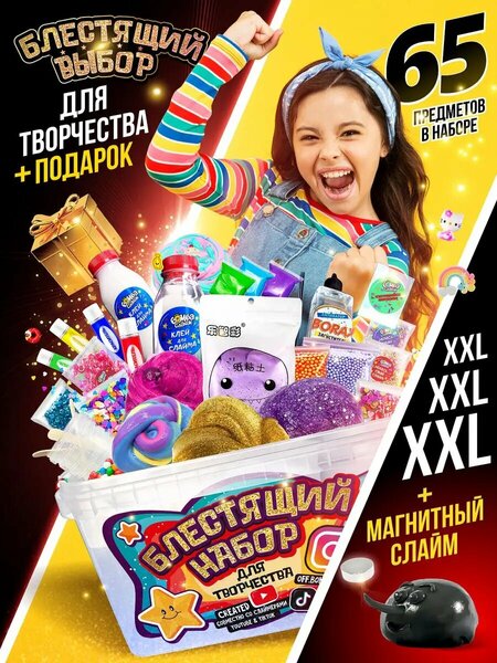 Набор слаймов 65 предметов в защитной коробке 31х23х18. В этом наборе необходимо делать слайм с помощью клея и активатора. В наборе есть все необходимое для опытов и экспериментов. Огромное количество посыпок, блесток и добавок. Слайм игрушки для девочек и мальчиков набор для творчества - идеальный подарок для любознательного ребенка! Этот набор является отличным способом стимулировать его креативность и развивать интерес к науке и экспериментам. В наборе вы найдете все необходимое для создания собственного уникального антистресса. Слаймы набор для творчества предлагают различные цвета и текстуры, чтобы дети могли воплотить свои самые смелые идеи. Готовый лизун в наборе сэкономит время и нервы и позволит делать опыты уже через минуту после открытия. Дети смогут проводить интересные эксперименты, узнавая о науке и ее принципах. Это отличная возможность для детей изучать и понимать физические и химические процессы. Наборы для творчесва и экспериментов включают в себя подробную инструкцию, которая поможет ребенку выполнить каждый опыт без труда. Набор слаймов и опытов также может быть отличным подарком как на день рождения и Новый год так и на любой праздник или другой особый случай. Это не только интересно и развлекательно, но и образовательно. Дети смогут проводить время с пользой и узнавать что-то новое каждый раз. Игрушки для девочек, игрушки для мальчиков, мальчиков разработаны таким образом, чтобы привлечь их внимание и развить их творческие способности. Набор для опытов подходит для девочек и мальчиков 3-15 (4,5,6,7,8,9,10,11,12,13,14,15) лет их фантазия и интересы не будут ограничены. Эта игрушка сделай сам прекрасно подходит, чтобы вдохновить детей быть самостоятельными и уверенными в своих силах. Слайм для девочек, слайм для мальчиков, никто из детей не пройдет мимо. Не упустите возможность порадовать ребенка этим замечательным подарком. Закажите набор для девочек, в который входит более 70 предметов таких как шармы для слаймов, блестки и светящийся