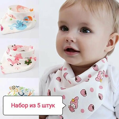 Идеальные слюнявчики на возраст с рождения до полутора лет. Набор из пяти хлопковых слюнявчиков. Тканевые, застегиваются на кнопки. Легко снять, легко надеть. Удобны в дни прорезывания зубов, во время прикорма, на прогулках. Можно использовать, как шарфик/снуд. Из личного опыта можем сказать, что одному малышу вполне хватает 8-10 слюнявчиков. Расцветки могут немного отличаться.