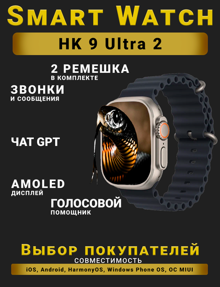 Смарт часы HK9 Ultra 2, Умные часы PREMIUM Series Smart Watch AMOLED наручные мужские и женские, iOS, Android, СhatGPT, Bluetooth Звонки, 2 ремешка, Черный