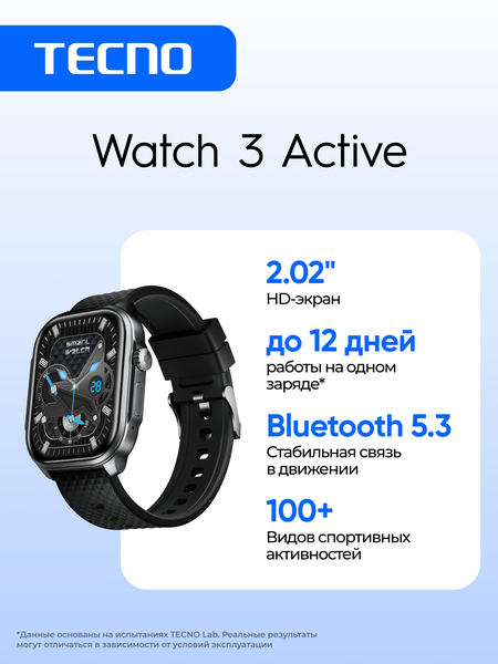 Cмарт-часы от TECNO подходят для любителей активного спорта и повседневного использования. Все важные уведомления, запросы к голосовому ассистенту, статистика тренировок и показатели здоровья всегда под рукой. — Большой HD-экран 2.02" — Чёткие звонки по Bluetooth — До 12 дней автономной работы — Умный AI-ассистент После синхронизации со смартфоном через Bluetooth пользователям доступны общение с AI-ассистентом, мониторинг показателей здоровья, а также ответ на вызовы. Управляйте задачами, получайте информацию и ответы на вопросы с помощью часов Watch 3 Active в рамках экосистемы TECNO. Создайте свой стиль с большим HD-экраном диагональю 2.02" благодаря более 150 вариантов циферблата. Наслаждайтесь насыщенным и чётким изображением даже при ярком солнце. Играйте во встроенные мини-игры, чтобы скоротать время в дороге, очереди или пробке. Отправиться в дальний поход с TECNO Watch 3 Active и продолжать отслеживать важные показатели теперь не проблема! Одного заряда аккумулятора хватит до 12 дней. TECNO Watch 3 Active помогают отслеживать ключевые показатели: пульс, уровень кислорода в крови, а также уровень стресса. Умные часы считают калории и анализируют активность. Выбрав одну из более 100 предустановленных спортивных активностей, пользователь сможет точно оценить качество тренировок и получить детальную статистику. Корпус часов квадратной формы выполнен из высокопрочного металла и стекла, что сохранит безупречный вид даже после активных приключений. Управлять TECNO Watch 3 Active удобно с помощью прокручивания колёсика, которое отвечает за плавный просмотр и навигацию в меню.