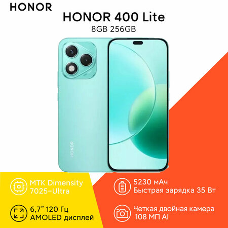 HONOR 400 Lite оснащен основной камерой с разрешением 108 Мп и светосильной оптикой (f/1,75), а также широкоугольной камерой 5 Мп с датчиком глубины. Двойная камера снимает повседневные сюжеты с высоким качеством и детализацией, воспроизводит естественный эффект боке и поддерживает три режима портретной съемки: атмосферный портрет (1x), классический портрет (2x) и портрет крупным планом (3x). Фронтальная камера HONOR 400 Lite с разрешением 16 Мп создана для ярких и детализированных селфи даже в сложных условиях освещения. Благодаря возможностям AI-движка HONOR Image Engine и алгоритму обработки изображений HONOR RAW Domain она интеллектуально балансирует светлые и темные участки фотографии, предотвращая пересвет ярких фрагментов и сохраняя четкость мельчайших деталей в тенях. Для съемки в условиях недостаточного освещения в смартфоне предусмотрена функция «Свет для селфи» — мягкая подсветка добавляет глубину и выразительность портретам. AMOLED-экран 6,7 дюймов с частотой обновления 120 Гц, разрешением 1080×2412 пикселей и полезной площадью 93,7% отображает 16,7 миллиона цветов и охватывает 100% цветового пространства DCI-P3, обеспечивая точную и насыщенную цветопередачу, а максимальная яркость экрана 3500 нит позволяет четко видеть контент на экране даже при ярком солнечном свете. HONOR 400 Lite поддерживает 7 технологий защиты зрения, которые снижают нагрузку на глаза и повышают комфорт при просмотре. ШИМ-частота 3840 Гц гарантирует отсутствие мерцание, аппаратная технология снижения уровня синего света уменьшает воздействие синего излучения, а динамическая яркость имитирует естественное солнечное освещение, помогая уменьшить утомляемость глаз. В вечернее время «Циркадный ночной экран» меняет цветопередачу на более теплые тона, способствуя выработке мелатонина и улучшению качества сна. HONOR 400 Lite с минималистичным дизайном и геометричными формами модуля основной камеры представлен в трех современных цветах: вельветовый серый, вельветовый черный и вельветовый бирюзовый. Благодаря эксимерной лазерной обработке задняя панель смартфона получила красивую матовую поверхность без бликов с бархатистой текстурой. HONOR 400 Lite весит всего 171 г при толщине корпуса 7,29 мм. Он легкий и удобно лежит в руке. Смартфон надежно защищен от повреждений при падениях во время повседневного использования, что подтверждает сертификат 5 звезд от компании SGS. Смартфон оснащен аккумулятором 5230 мА·ч, который рассчитан на долгий срок службы и сохраняет более 80% емкости даже после 1000 циклов зарядки. Адаптер HONOR SuperCharge 35 Вт заряжает телефон до 52% всего за 30 минут и до 100% — за 73 минуты. Процессор MediaTek Dimensity 7025-Ultra обеспечивает высокую производительность для повседневного использования и развлечений.