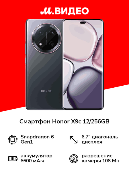 Смартфон Honor X9c Titanium Black обладает восьмиядерным процессором Qualcomm Snapdragon 6 gen1 частотой 4x2,2 ГГц + 4x1,8 ГГц и 12 Гб оперативной памяти, которые гарантируют быструю и стабильную работу, в том числе в режиме многозадачности, позволяют играть в современные ресурсоемкие игры. • 256 Гб встроенной памяти Дает возможность установить значительное количество необходимых приложений, хранить множество фото, видео, различных документов и прочих файлов. • Суперпрочный корпус Смартфон защищен от ударов и, согласно тестированию производителя, выдерживает падения с высоты до 2 м. • 6,7-дюймовый экран Выполнен по технологии AMOLED, обладает разрешением 2700x1224 пикселей. Демонстрирует высокую контрастность и реалистичную цветопередачу. • Технологии защиты зрения Экран Eye Comfort исключает мерцание при низкой яркости, имитирует естественное освещение и уменьшает напряжение глазных мышц. В течение дня температура света автоматически регулируется, вечером цвета более теплые и приятные для глаз. • Кремний-углеродный аккумулятор 6600 мА*ч Предоставляет длительную автономную работу: более 25 часов просмотра видео, более 48 часов прослушивания музыки. Поддерживается супербыстрая зарядка Turbo 66 Вт, которая активируется нажатием на одну кнопку. • Работа при экстремальных температурах При -30°С смартфон сможет проработать в режиме голосовых вызовов до 20 часов, при +55°С - до 30 часов. Honor X9c получил тыловую камеру на 108 Мп, дополненную широкоугольной на 5 Мп. Поддерживается цифровой зум 10x для приближения удаленных объектов. Возможна съемка видео в качестве до 4К. Фронтальная камера на 16 Мп может записывать видеоролики до 1080р. Предустановлены многочисленные режимы, среди которых Живое фото, ночной, портретный, панорамный, зеркальный и другие.