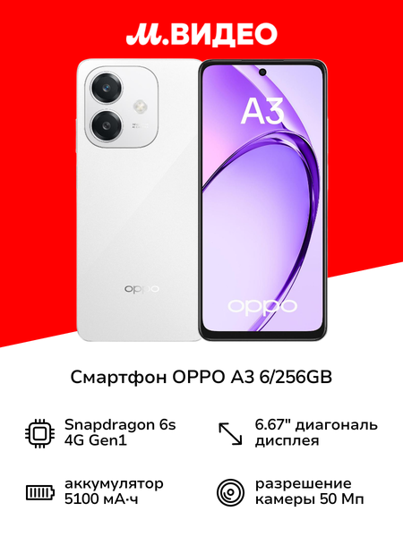 Смартфон Oppo A3 Starlight White работает на операционной системе Android 14.0 с оболочкой ColorOS. • Пиковая яркость 1000 нит Позволяет пользоваться телефоном при любом освещении - изображение не поблекнет. • Устойчивость к жидкостям Смартфон защищен от попадания влаги: случайно пролитый чай или попадание под дождь ему не повредят, работоспособность сохранится даже с мокрым экраном. • Сертификат SGS Соответствие швейцарскому стандарту качества, устойчивость к ударам, в том числе при падениях. В основе смартфона - восьмиядерный процессор Qualcomm Snapdragon 6s 4G Gen 1 частотой 2,1 ГГц и 6 Гб оперативной памяти. Объем флеш-памяти - 256 Гб, хранилище можно расширить за счет карты microSD. LCD-экран обладает диагональю 6,67 дюйма разрешением HD + (1604х720 пикселей) - удобно решать рабочие задачи, просматривать документы, читать, общаться в соцсетях и смотреть фильмы. Частота обновления 90 Гц обеспечивает плавное отображение любого динамичного контента. Тыловая камера смартфона на 50 Мп с углом обзора 76° поддерживает автофокусировку, что упрощает получение четких снимков. Фронтальная камера - на 5 Мп, угол обзора - 78°. Предустановлено множество режимов, включая ночной, панорамный, портретный, режим замедленной съемки и другие. Обе камеры могут снимать видео в качестве 1080p. Смартфон Oppo A3 оснащен аккумулятором емкостью 5100 мА*ч и поддерживает быструю зарядку Supervooctm 2.0 мощностью 45 Вт. Время работы в режиме разговора достигает 30 часов, при ожидании - 370 часов.