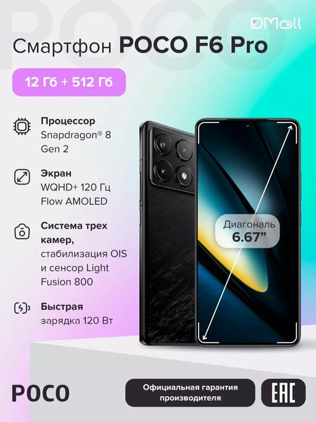POCO F6 Pro: Мощь и скорость в твоих руках! Готов к невероятным ощущениям? POCO F6 Pro - это не просто смартфон, это портативный суперкомпьютер, в котором скорость и мощность сливаются воедино. Смартфон с флагманским процессором Snapdragon® 8 Gen 2 - сердцем истинного флагмана. Благодаря мощнейшему процессору и Adreno 740, POCO F6 Pro без труда справляется с самыми тяжелыми играми и приложениями, не заставляя тебя ждать. Зарядись за считанные минуты с HyperCharge 120 Вт! Забыть о долгих часах зарядки - вот что значит быть в ритме жизни. Зарядка от 0 до 100% всего за 17 минут - с POCO F6 Pro ты всегда на связи! И да, 120 Вт адаптер в комплекте. WQHD+ 120 Гц Flow AMOLED дисплей: визуальное совершенство. Уникальная плавность движения и яркость 4000 нит делают каждое изображение нереально живым и реалистичным. А цвета? 100% DCI-P3 - яркость и глубина, что не оставит равнодушным никого. 50 Мп, OIS, система из 3 камер: захвати момент во всей красе. Детализированные снимки при любом освещении, ультраширокоугольный объектив для шикарных панорам и макрообъектив, чтобы увидеть красоту ближе. Ты всегда получишь идеальный кадр, готовый к публикации в социальных сетях. Премиальный дизайн: стильный металлический корпус и защитное стекло Gorilla Glass 5 спереди делают POCO F6 Pro не только мощным, но и красивым. И это еще не все! NFC для бесконтактных платежей, подэкранный сканер отпечатков пальцев, ИК порт и многое другое сделают твою жизнь еще комфортнее. POCO F6 Pro - это не просто смартфон, это твой верный спутник в мире инноваций! Переходи на новый уровень! Закажи POCO F6 Pro уже сегодня