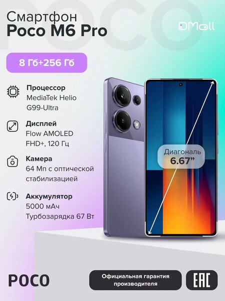 Смартфон POCO M6 Pro RU 8+256 ГБ/Purple/6.67"FHD+/AMOLED/Ростест