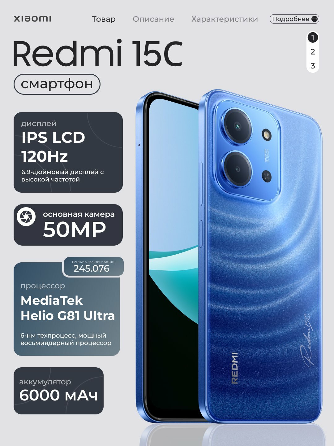 REDMI 15C — Мощь и стиль в одном корпусе Аккумулятор 6000 мАч и быстрая зарядка 33 Вт Забудьте о подзарядке на весь день — ёмкий аккумулятор 6000 мАч обеспечит до двух суток активного использования. А с поддержкой быстрой зарядки 33 Вт вы получите 50% за считанные минуты — адаптер уже в комплекте. Большой 6.9" дисплей 120 Гц — максимум погружения Наслаждайтесь плавной прокруткой, четкими цветами и эффектом полного погружения благодаря 6.9-дюймовому IPS-экрану с частотой обновления 120 Гц и каплевидным вырезом. Отлично подойдёт для видео, игр и соцсетей. Производительность на уровне — MediaTek Helio G81 Ultra Процессор с 8 ядрами (2x2.0 ГГц + 6x1.7 ГГц), изготовленный по 12-нм техпроцессу, в паре с графикой Mali-G52 MC2 и оперативной памятью до 8 ГБ справится с любыми задачами: от повседневных до игр и многозадачности. Камеры с искусственным интеллектом — делайте кадры как профи Основная камера 50 Мп с автофокусом и поддержкой ИИ делает чёткие и насыщенные снимки даже при плохом освещении. Дополнительная камера QVGA помогает в портретах и глубине. Фронталка 8 Мп — для селфи и видеозвонков. Простор для данных — до 256 ГБ + microSD до 1 ТБ Выбирайте между 128 или 256 ГБ встроенной памяти и расширяйте до 1 ТБ с помощью отдельного слота под карту microSD — удобно и без компромиссов. Все современные интерфейсы: Bluetooth 5.3 и двухдиапазонный Wi-Fi GPS, A-GPS, ГЛОНАСС, Galileo, Beidou USB Type-C с поддержкой OTG 3.5 мм аудиоразъём и FM-радио Безопасность: Сканер отпечатков пальцев сбоку Разблокировка по лицу HyperOS на базе Android 15 — новый уровень плавности и стабильности. Цвета: зелёный, синий, песчаный, чёрный. В комплекте: смартфон, адаптер 33 Вт, кабель, документация.