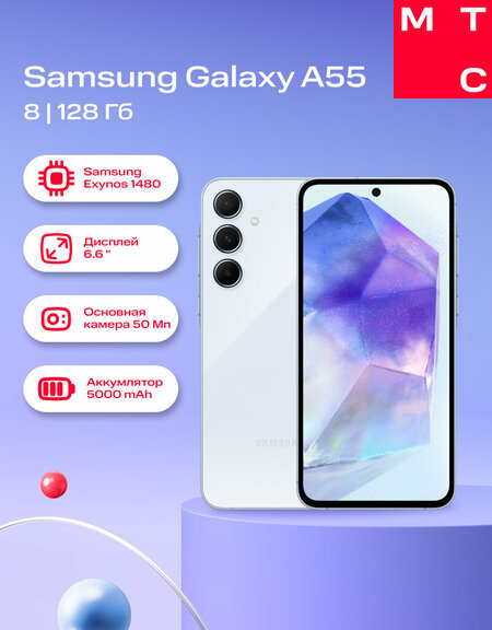 SAMSUNG Galaxy A55 — смартфон с большим четким дисплеем, качественной системой камер и фирменным дизайном. Устройство получило емкую батарею и прочный корпус с защитой от влаги по стандарту IP67. На лицевой панели смартфона — дисплей с тонкими рамками и круглым вырезом под селфи-камеру. Задняя панель покрыта стеклом. Здесь находятся три камеры, расположенные вертикально в ряд. Плоские боковые грани изготовлены из металла. Кнопка включения и переключатель громкости расположены на одной стороне и слегка выступают над корпусом для удобства. Смартфон поддерживает установку двух физических SIM-карт и eSIM. Есть лоток для карты памяти формата microSD емкостью до 1 ТБ. Для бесконтактной оплаты в магазинах предусмотрен модуль NFC. АО «РТК» уведомляет о недостатке товара: «Товар с недостатком: на момент покупки не предустановлены обязательные приложения, в том числе единый магазин приложений. Требуется самостоятельная установка после приобретения».