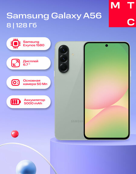 Смартфон Samsung Galaxy A56 — устройство толщиной 0.74 см и весом 198 г, подходящее для разных задач: интернет-серфинга, просмотра видеоконтента, запуска ресурсоемкого ПО для обработки контента, гейминга и др. Корпус со скругленными углами имеет стильное и лаконичное оформление. Кнопки включения и регулировки звука расположены на правой боковой стороне. Глянцевая задняя поверхность не собирает пятна и следы от пальцев. Задний блок камер сгруппирован и помещен на овальную основу, которая не сильно выпирает — за счет этого удобно набирать текст или прокручивать новостную ленту, когда смартфон находится на столе. Корпус обладает улучшенной защитой от воздействия пыли и влаги — класс IP67. Это говорит о том, что аппарат можно использовать при любых погодных условиях. Кроме того, он может выдержать погружение в пресную воду на глубину до 1 метра на срок до 30 минут. Galaxy A56 поставляется с обновленной ОС One UI 7, разработанной на базе Android. Она предлагает улучшенный интерфейс, широкий набор оригинальных тем, эффектные и плавные анимации, стильные значки. Предустановленные виджеты отображают разнообразную информацию, включая время и прогноз погоды. Любые из них можно вывести на главный экран, чтобы всегда иметь под рукой нужные сведения. Оболочка One UI разрабатывалась с большим акцентом на конфиденциальность данных. Для этого используется Samsung Knox — собственная платформа безопасности. Она служит для шифрования данных и быстрого реагирования на попытки взлома. С этой платформой можно защитить данные банковской карты, вход в аккаунты в социальных сетях, личные фотографии и прочую информацию. Единая экосистема Samsung Galaxy упрощает взаимодействие между Galaxy A56 и другими устройствами для общения, развлечений, работы. Мощная аппаратная платформа Высокая производительность и стабильная работа всех процессов в системе обусловлено восьмиядерным процессором (Octa-Core) с тактовой частотой 1.9 ГГц, 2.6 ГГц и 2.9 ГГц. Он обеспечивает комфортную эксплуатацию устройства в режиме многозадачности. Максимально плавный процесс во время игровых баталий или трансляции видео позволит насладиться контентом. Объем оперативной памяти составляет 8 ГБ. Хранилище рассчитано на 256 ГБ — этого достаточно, чтобы установить необходимые приложения и оставить место для сохранения фото и видео. Яркий FHD+ экран Galaxy A56 имеет Super AMOLED экран. Его диагональ составляет 17.01 см (полный прямоугольник) или 16.55 см (закругленные углы). Разрешение 1080 х 2340 пикселей обеспечивает высокую детализацию. Отображаемый на экране контент получается четким, контрастным и насыщенным. Максимальная частота обновления достигает 120 Гц, что гарантирует отличную плавность вне зависимости от сценария использования смартфона. Пиковая яркость достигает 1200 нит. Искусственный интеллект В Samsung Galaxy A56 внедрены функции с использованием Galaxy AI. Они упрощают и ускоряют выполнение многих задач. В частности, функция «Обведите и найдите» с технологиями Google позволяет быстро найти информацию о тексте или объекте, который отображается на экране. Также с ее помощью можно мгновенно перевести всю текстовую информацию на экране без переключения между приложениями. Обычные наброски можно превратить в эффектные картины в разных стилях — таких, как акварель, скетч, иллюстрация, поп-арт и 3D-мультфильм. Функция «Синхронный перевод» помогает 
