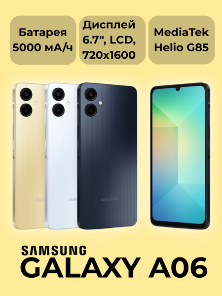 Samsung Galaxy A06 — это практичный и доступный смартфон, который предлагает все необходимые функции для повседневного использования. С его простым, но стильным дизайном, устройство удобно лежит в руке и легко подходит для любых повседневных задач. Смартфон оснащен ярким дисплеем, который обеспечивает четкое и насыщенное изображение, делая просмотр видео, серфинг в интернете и использование приложений приятным опытом. Galaxy A06 идеально подходит для мультимедийного контента и социальных сетей, позволяя пользователям наслаждаться всемирной паутиной с комфортом. Производительность устройства поддерживается современным процессором и достаточным объемом оперативной памяти, что обеспечивает плавную работу приложений и многозадачность. Несмотря на свою доступность, Galaxy A06 не уступает в качестве, позволяя пользователям без проблем запускать повседневные приложения и игры. Камера смартфона позволяет делать яркие и четкие снимки, обеспечивая хорошие результаты в различных условиях освещения. Долговечная батарея обеспечивает продолжительное время работы, позволяя оставаться на связи в течение всего дня без необходимости частой подзарядки. Интуитивно понятный интерфейс Samsung One UI упрощает навигацию и настройку устройства под личные предпочтения. Galaxy A06 станет надежным спутником для пользователей, ищущих бюджетный и функциональный смартфон, который справится с повседневными задачами.