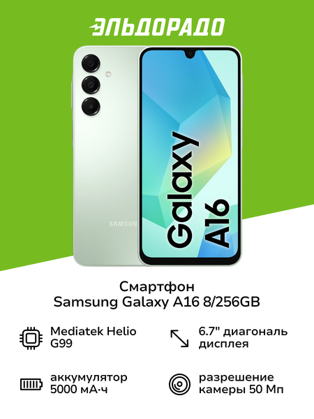 Смартфон Samsung Galaxy A16 Mint получил 6,7-дюймовый экран, выполненный по технологии Super AMOLED. Изображение разрешением 2340x1080 пикселей отлично детализированное, с яркими реалистичными цветами и высокой контрастностью. • 256 Гб встроенной памяти Достаточно для установки множества приложений, хранения значительного количества фотографий, видеороликов, музыки, аудиокниг, документов и прочих файлов. • Восьмиядерный процессор MediaTek Helio G99 В сочетании с 8 Гб оперативной памяти отвечает за быстрое и стабильное протекание всех процессов. • Толщина всего 7,9 мм Обеспечивает удобство использования. Тыловая камера тройная: 50 Мп - основная, 5 Мп - ультраширокоугольная, 2 Мп - макро. Для селфи предназначена фронтальная камера на 13 Мп. Основная камера оснащена десятикратным цифровым зумом, который поможет получить качественные снимки удаленных объектов. Корпус смартфона выполнен в соответствии со стандартом IP54 - не боится пыли и воздействия капель дождя и брызг. Установлен аккумулятор емкостью 5000 мА*ч, для зарядки используется USB Type-C. Ресурса батареи хватит на 19 часов интернет-серфинга, на 18 часов просмотра видео. Авторизация производится на основе распознавания отпечатка пальца.