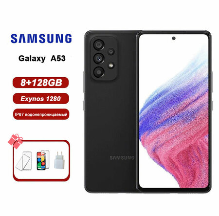 Galaxy A53 оснащен восьмиядерным процессором Samsung Exynos 1280, изготовленным по 5-нм техпроцессу и работающим на частоте до 2,4 ГГц. По сравнению с предшественником Exynos 1280 обеспечивает значительный рост производительности и энергоэффективности, позволяя телефону более плавно запускать различные приложения и игры и обеспечивая более длительное время автономной работы. Что касается оперативной памяти, то она составляет 8 ГБ, что обеспечивает бесперебойную работу телефона. фото: Galaxy A53 оснащен четырьмя задними и одной фронтальной камерами. Основная задняя камера - 64-мегапиксельная с оптической стабилизацией OIS и поддержкой записи видео 4K, 12-мегапиксельная ультраширокоугольная камера с углом обзора 123°, 5,4-мегапиксельная макрокамера и 5-мегапиксельная камера с глубиной резкости. Фронтальная камера имеет разрешение 32 мегапикселя и поддерживает такие функции, как запись видео 4K и HDR10+, чтобы удовлетворить потребности пользователей в съемке различных сцен и сделать более профессиональные фотографии. Аккумулятор: Galaxy A53 оснащен встроенным аккумулятором большой емкости 5 000 мАч, поддерживающим технологию быстрой зарядки 25 Вт, чтобы удовлетворить потребности пользователей в длительном использовании. Он также поддерживает защиту от воды и пыли по стандарту IP67, что позволяет использовать его в условиях высокого давления воды, например под душем или под водой.