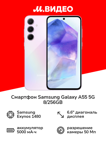 Смартфон Samsung Galaxy A55 Lavender обладает большим экраном диагональю 6,6 дюйма разрешением 2340х1080 пикселей, на котором комфортно играть, смотреть фильмы и видеоролики, общаться в социальных сетях, решать рабочие задачи. Технология AMOLED обеспечивает высокую яркость и контрастность, даже при ярком солнце картинка будет различима. Частота обновления 120 Гц способствует плавности отображения любого динамичного контента. Экран покрывает прочное стекло Corning Gorilla Glass Victus. Аппаратная часть представлена восьмиядерным смартфоном Samsung Exynos 1480 частотой 2,75 ГГц и 8 Гб оперативной памяти. Для хранения информации предусмотрены 256 Гб встроенной памяти, которую можно расширить, установив карту microSD (до 1024 Гб). Поддерживаются современные сети вплоть до 5G, выход в интернет обеспечивает встроенный модуль Wi-Fi, синхронизацию и обмен данными с другими девайсами - Bluetooth версии 5.3. Сориентироваться в любой незнакомом месте и проложить маршрут помогут навигационные системы GPS, ГЛОНАСС, Beidou, Galileo и QZSS. Получить высококачественные фотографии и видео в разрешении до UHD 4K (3840х2160 пикселей) со скоростью 30 кадр/с позволит тройная основная камера, представленная тремя объективами: 50 Мп, 12 Мп и 5 Мп. Доступен цифровой зум до 10x, стабилизация изображения устранит помехи. Для селфи и общения по видеосвязи установлена фронтальная камера на 32 Мп. Авторизация производится по отпечатку пальца или сенсору распознавания лица. Смартфон оснащен интерфейсом USB Type-C. Емкость аккумулятора - 5000 мА*ч, он предоставляет до 28 часов воспроизведения видео, до 24 часов работы в Сети по Wi-Fi, до 79 часов прослушивания аудио (в беспроводном режиме). Размеры смартфона: 161,1х74,4х8,2 мм, вес - 213 г.