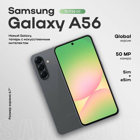 Смартфон Samsung Galaxy A56 предлагает функции искусственного интеллекта. Мгновенный поиск с помощью Surround to Search, персональный помощник Gemini, редактируйте фотографии с помощью Object Eraser, персонализируйте снимки с помощью фильтров, создавайте видеоролики за считанные секунды с помощью функции редактирования на основе искусственного интеллекта. Дисплей 6,7-дюймовый FHD+ Super AMOLED стал больше и ярче до 1200 нит, а улучшенный процессор обеспечивает высокую производительность. Galaxy A56 5G имеет сертификат водонепроницаемости IP67, что делает его устойчивым к воздействию воды и пыли. Различные датчики Galaxy A56 были улучшены для повышения качества изображения. Запечатлейте невероятные моменты в высоком разрешении: с помощью сверхширокоугольного объектива 12 МП, основного датчика 50 МП, макродатчика 5 МП на задней панели, а также 12 МП фронтальной камеры (селфи). Емкость аккумулятора Galaxy A56 составляет 5000 мАч. Он обеспечивает до 29 часов воспроизведения видео и до 2,5 дней автономной работы.