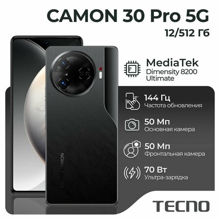 CAMON 30 Pro 5G История в каждом кадре Смартфон оснащен флагманскими характеристиками для съемки разнообразного контента в высоком качестве и множеством дополнительных опций, которые максимально приближают возможности CAMON 30 Pro 5G к профессиональной съемке. - Основная камера 50 Мп с сенсором SONY IMX890 с оптической стабилизацией - Съемка в формате 4К 60 к/с - Фронтальная камера 50 Мп с автофокусом по глазам Плавная и быстрая работа в любых условиях Мощный процессор и внушительный объем памяти позволяют с комфортом использовать смартфон даже в режиме многозадачности. - Процессор Dimensity 8200 Ultimate - Постоянная память 512 Гб - Оперативная память 12 Гб с возможностью виртуального разрешения +12 Гб Высокое качество изображения и превосходное звучание Играйте в современные игры, смотрите любимые фильмы и сериалы с отличным визуальным охватом и чистым стереозвуком. - AMOLED экран 6,8” 120 Гц - 48 мес — гарантия сохранения плавной работы - Повышенная частота обновления 144Гц - Стереодинамики с поддержкой Dolby Atmos Обновленный дизайн Дизайн CAMON 30 Pro 5G имеет две акцентные детали — плавную изогнутую линию, напоминающую изгиб корпуса винтажного фотоаппарата, и алюминиевое кольцо с рифленой кромкой вокруг модуля камер, которое является отсылкой к профессиональным объективам. А в левом верхнем углу расположен индикатор записи, как у профессиональной камеры — это новый функциональный элемент линейки CAMON.
