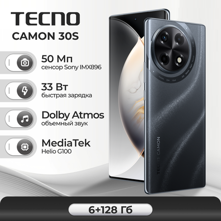 CAMON 30S История в каждом кадре. Съемка высокой четкости 100 Мп Отличные возможности для съемки фото и видео высокого качества в новом корпусе. - Основная камера 50 Мп с оптической стабилизацией OIS и режимом съемки высокой четкости 100 Мп - Широкая площадь 1/1.56" светочувствительного сенсора Sony IMX896 - Изогнутый AMOLED-экран частотой обновления 120 Гц, защищенный стеклом Corning Gorilla Glass 5 - Новый формат для съемки контента с соотношением сторон 16:9 Съемка высокой четкости 100 Мп Основная камера смартфона с разрешением 50 Мп оснащена светочувствительным сенсором флагманского уровня 1/1.56" Sony IMX896 и оптической стабилизацией OIS. Гарантированное ультрачеткое качество снимков, в том числе за счет режима съемки высокой четкости 100 Мп. Контент без границ Изогнутый AMOLED-дисплей диагональю 6,8” c частотой обновления 120 Гц дает ощущение безрамочного экрана. Двойные стереодинамики с поддержкой Dolby Atmos обеспечивают качественное звучание независимо от воспроизводимого контента. Новый уровень производительности Мощный восьмиядерный процессор MediaTek G100 дополнен большим объемом постоянной и оперативной памяти для эффективной и многозадачной работы: - Постоянная память 256 Гб Безопасная зарядка Смартфон оснащен энергоемким аккумулятором 5000 мАч, а пополнить заряд энергии помогает комплектная быстрая зарядка мощностью 33 Вт. Пользователь может выбрать один из трёх режимов скорости зарядки: сверхбыстрый, умный для сбалансированной зарядки и низкотемпературный. Дизайн просто космос Визуально модель выглядит тоньше других смартфонов серии CAMON 30, но дизайн все также отсылает к деталям профессионального фотоаппарата. Круглый блок камер напоминает объектив с рифленой кромкой и упоминанием характеристик. Все версии имеют заднюю пластиковую панель с рисунком, напоминающий еле уловимый Млечный путь на ночном небе.