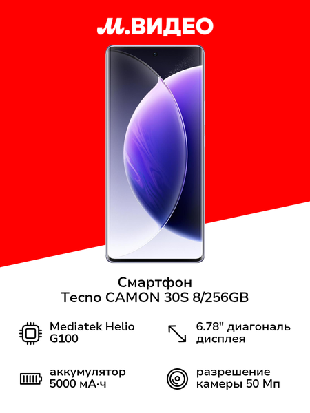 Смартфон Tecno Camon 30S Nebula Violet получил восьмиядерный процессор MediaTek Helio G100 частотой 2,2 ГГц и 8 Гб оперативной памяти. • 256 Гб флеш-памяти Позволяет установить необходимые приложения и хранить много различных документов, видеороликов, фотографий, музыки и прочего. • AMOLED-экран диагональю 6,78 дюйма Обладает разрешением 1080x2436 пикселей, отличается высокой яркостью и точность передачи цветов. Защищен стеклом Corning Gorilla Glass 5. • Частота обновления 120 Гц Гарантирует, что любой динамичный контент будет отображаться плавно. Основная камера двойная: 50/2 Мп, она поддерживает цифровую стабилизацию для повышения четкости картинки при съемке в сложных условиях и цифровой зум 10х для приближения объектов. Двойная вспышка поможет получить снимки высокого качества в темное время суток. С помощью фронтальной камеры на 13 Мп, оснащенной автофокусом, можно снимать селфи, общаться по видеозвонку. За выход в Сеть отвечает модуль Wi-Fi, за подключение беспроводной периферии - Bluetooth 5.3, поддерживается также технология NFC. Двойные стереодинамики с поддержкой Dolby Atmos выдают громкий детализированный звук. Интерфейс подключения зарядного устройства - USB Type-C. Автономную работу до 48 часов в режиме разговора обеспечивает аккумулятор емкостью 5000 мА*ч. Поддерживается быстрая зарядка 45 Вт. Корпус выполнен из пластика по стандарту IP53.