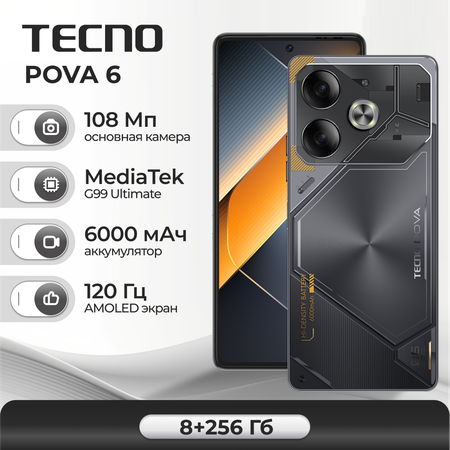 POVA 6 Отличная автономность и выбор скорости зарядки Энергоемкий аккумулятор дополнен зарядкой с различными режимами работы, которые можно менять в различных сценариях, чтобы продлить срок службы батареи. - Аккумулятор 6000 мАч - Ультра-зарядка 70 Вт - 3 режима скорости зарядки - Повышенная выносливость при 1% заряда - Заряжается при морозе до -20°C Еще больше удовольствия от игр и контента Практически безрамочный широкий AMOLED экран, и, впервые в смартфоне TECNO, объемный звук DOLBY ATMOS. Интересное кино и любимые игры в лучшем качестве. - Тонкая рамка экрана 1,3 мм - FHD+ AMOLED экран 120 Гц - Объемный звук DOLBY ATMOS - 4D виброотклик Высокая производительность при интенсивной нагрузке Мощный процессор и внушительный объем памяти в сочетаются с дополнительными движками для работы в режиме многозадачности и с ресурсозатратными программами. - Процессор MediaTek G99 Ultimate - Память 256 + 24 Гб* (*с учетом расширения ОЗУ) - Game Space 4.0 — отдельное пространство для комфортной игры - Функция дублирования экрана смартфона на дисплее ПК Создавайте захватывающий контент Система камер POVA 6 открывает новые горизонты для создания контента. - Основная камера 108 Мп - 10-кратный цифровой зум - Фронтальная камера 32 Мп с выбором тона подсветки - Режим Super Night для качественных фото в условиях низкой освещенности Технологичный дизайн Эстетика научной фантастики и динамичные элементы придутся по вкусу любителям цифровой вселенной и эры искусственного интеллекта. Корпус смартфона обладает светодиодной подсветкой с настройками множества сценариев. POVA 6 выпускается в трех вариантах цветов: Серый метеорит, Зелёная комета и Голубая звезда.