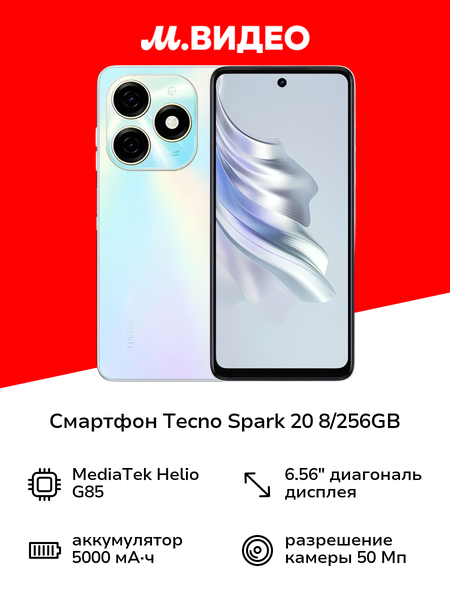 Смартфон Tecno Spark 20 Cyber White - это большой 6,56-дюймовый IPS-экран разрешением 1612x720 пикселей и высокая производительность, которая обеспечивается восьмиядерным процессором Mediatek Helio G85 2 ГГц и 8 Гб ОЗУ. Объем встроенной памяти - 256 Гб. Для расширения хранилища можно добавить карту microSD (до 1024 Гб). Возможна установка двух SIM-карт формата nano, поддерживается работа в сетях до 4G LTE. Беспроводные технологии представлены модулями Wi-Fi (выход в интернет), Bluetooth (обмен данными с устройствами, поддерживающими эту технологию), NFC (оплата, проверка баланса транспортной карты и другое). Навигационные системы GPS и ГЛОНАСС позволят точно определить свое местоположение, помогут не потеряться в незнакомом месте и проложить любой маршрут. Основная камера разрешением 50/50/50 Мп снабжена вспышкой и позволяет сделать четкие снимки даже при тусклом освещении. Для селфи предусмотрена фронтальная камера на 32 Мп. Установлен аккумулятор емкостью 5000 мА*ч с поддержкой быстрой зарядки. Корпус выполнен из пластика.