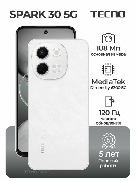 TECNO SPARK 30 5G Меняйся со SPARK TECNO Spark 30 5G — надежный смартфон со сбалансированными характеристиками для ценителей стильного дизайна. Производительность и энергичность Смартфон оснащен процессором MediaTek Dimensity 6300 5G, который поддерживает высокоскоростное подключение связи. Постоянная память 128 ГБ вместе с 6 ГБ оперативной памяти с возможностью расширения на 6 ГБ обеспечивает сбалансированную работу устройства. Также TECNO Spark 30 5G имеет слот для карты памяти micro SD до 1 ТБ. Энергоэффективный аккумулятор емкостью 5 000 мАч даже после 1000 циклов зарядки сохраняет более 80% своей первоначальной емкости. Быстрая зарядка 18 Вт Type-C в короткие сроки пополнит заряд смартфона. Снимки высокой четкости Снимайте четкие и качественные фото и записывайте яркие видео в формате до 2K 30 к/с на основную камеру разрешением 108 Мп. Фронтальная камера имеет разрешение 8 Мп и встроенную вспышку с настройкой яркости и температуры света для ярких селфи. Экран и звук для просмотра контента TECNO Spark 30 5G получил дисплей с плавным изображением, адаптивная частота обновления экрана для каждого сценария до 120 Гц сохраняет как можно дольше максимальную энергоэффективность смартфона. Вместе со стереодинамиками с объёмным звуком Dolby Atmos и поддержкой Hi-Res Audio легко окунуться с головой в мир просматриваемого контента. Также TECNO Spark 30 5G оснащен разъемом Mini Jack 3.5 мм для проводных наушников. Стильный и надежный дизайн Корпус смартфона выполнен из ударопрочного пластика, прошедшего тест на более чем 25 000 падений. Ни частицы пыли, ни случайные брызги не страшны смартфону SPARK 30 5G с защитой IP54. TECNO Spark 30 5G представлен в трех цветах: белый, чёрный и мятный.