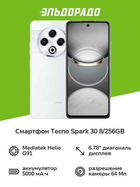 Смартфон Tecno Spark 30 Astral Ice оснащен восьмиядерным процессором MediaTek Helio G91 и 8 Гб оперативной памяти. Модель работает на ОС Android 14. • 256 Гб флеш-памяти Позволяет установить нужные приложения и хранить множество различных документов, видеороликов, фотографий, музыки и прочего. • IPS-экран диагональю 6,78 дюйма Обладает разрешением 2436x1080 пикселей, характеризуется высокой яркостью и точностью передачи цветов. Частота обновления 90 Гц гарантирует плавность прокрутки страниц и отображения любого динамичного контента. • Поддержка HDR Расширенный динамический диапазон, улучшает цветопередачу и детализацию. Основная камера двойная: 64/0,08 Мп, она оснащена цифровым зумом 10х для приближения удаленных объектов и четверной вспышкой. С помощью фронтальной камеры на 13 Мп можно делать селфи, общаться по видеосвязи, принимать участие в видеоконференциях. Предусмотрена двойная вспышка с возможностью регулирования световой температуры. Корпус смартфона выполнен из пластика по стандарту IP64 - ему не страшны пыль и капли дождя. Автономную работу до 18 часов в режиме разговора обеспечивает аккумулятор емкостью 5000 мА*ч.