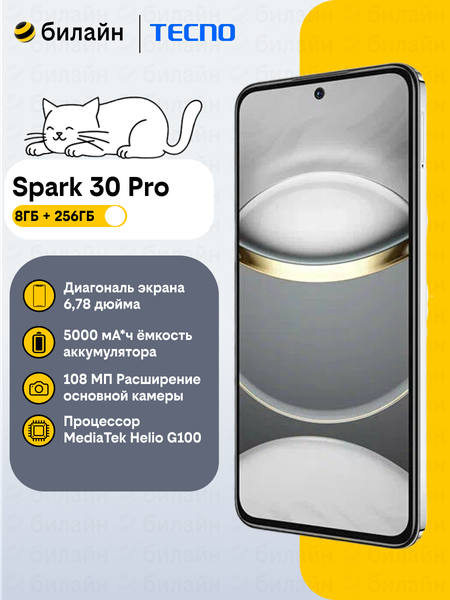 AMOLED 120 Гц Обеспечивает плавность изображения, а ШИМ-регулировка яркости в 2160 Гц — комфорт глазам. Сертифицированный дисплей AMOLED с низким уровнем синего света и пиковой яркостью в 1700 нт делает изображение реалистичным и невероятно чётким. Аккумулятор на 5000 мА·ч Хватит для целого дня работы устройства. Зарядка на 33 Вт позволит восполнить затраченную энергию за считанные минуты. Симметричный стереозвук Громкость можно увеличить до 300%. Любимая музыка и фильмы с TECNO Spark 30 Pro раскроются перед вами по-новому. Пыле- и влагозащищённость по стандарту IP54 TECNO Spark 30 Pro не боится песка и влаги и готов отправиться с вами куда угодно. Устройство корректно работает, даже если нажимаете на экран мокрыми пальцами. Внутреннее хранилище 128 или 256 ГБ (зависит от модели) внутренней памяти позволят хранить все ваши видео, изображения и документы в смартфоне без необходимости переносить их на другие устройства или облачные сервисы. 5 лет гарантии работы без задержек Процессор MediaTek Helio G100 с 8 ГБ оперативной памяти обеспечивает быстрый запуск приложений и бесперебойную стабильную работу смартфона в течение 5 лет.