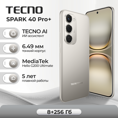 TECNO SPARK 40 Pro+ Тонкий, тоньше, ещё тоньше Смартфон TECNO Spark 40 Pro+ с новым процессором MediaTek G200 и беспроводной зарядкой. Рекордно тонкий, элегантный и надёжный гаджет. Производительность нового уровня Смартфон первым получил новый мощный процессор MediaTek G200. Постоянная память 256 ГБ вместе с 8 ГБ оперативной памяти с возможностью расширения на 3, 5 или 8 ГБ обеспечивает сбалансированную работу устройства. Энергоэффективный аккумулятор емкостью 5 200 мАч обеспечивает целый день работы устройства. В комплекте со смартфоном идёт чехол с магнитными вставками для удобной беспроводной зарядки 30 Вт, также пополнить энергию смартфона можно с помощью быстрой зарядки 45 Вт Type-C. TECNO Spark 40 Pro+ может выполнять задачи пауэрбанка, в модели доступна беспроводная реверсивная зарядка мощностью 5 Вт и проводная 10 Вт. Сверхъяркий экран и звук для просмотра контента TECNO Spark 40 Pro+ получил изогнутый AMOLED-экран диагональю 6.78” со сверхчётким разрешением 1.5K защищён закалённым стеклом Gorilla® Glass 7i. Частота обновления до 144 Гц обеспечивает отличную динамику и плавную прокрутку контента. Яркость до 4500 нит позволяет с комфортом пользоваться смартфоном даже в солнечный день. Ныряйте с головой в киномарафоны и мобильный гейминг вместе со стереодинамиками с объёмным звуком Dolby Atmos. Искусственный интеллект TECNO AI Умный ассистент Ella умеет общаться и распознавать голосовые команды на русском языке, выполняет разные запросы — от удаления лишних объектов на фото до заказа такси. Смартфон TECNO Spark 40 Pro+ также умеет с помощью TECNO AI генерировать и редактировать тексты, осуществлять быстрый поиск информации как на устройстве, так и в интернете. Стильный и надёжный дизайн Изогнутая и обтекаемая со всех сторон форма корпуса смартфона с равномерно скошенными краями как на передней, так и на задней панели, визуально уменьшает и без того максимально узкую боковую рамку 6.49 мм и увеличивает ударопрочность девайса. TECNO Spark 40 Pro+ очень лёгкий — всего 160 граммов. Ни частицы пыли, ни случайные брызги не страшны смартфону с защитой уровня IP64. TECNO Spark 40 Pro+ представлен в четырёх цветах: Туманный чёрный, Утренний белый, Лунный титановый, Зелёная тундра.