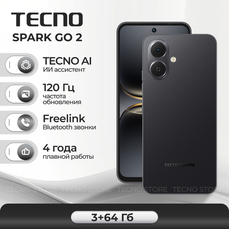 TECNO SPARK GO 2 Ничего лишнего. Только SPARK TECNO Spark Go 2 — надёжный смартфон со сбалансированными характеристиками для ежедневного пользования и искусственным интеллектом TECNO AI. Эффективная производительность Производительный процессор Unisoc T7250 обеспечивает быструю работу девайса и загрузку контента. Большой объём памяти доступен в нескольких конфигурациях: - 64 ГБ ПЗУ + 3 ГБ ОЗУ (с расширением на 3 ГБ) - 64 ГБ ПЗУ+ 4 ГБ ОЗУ (с расширением на 4 ГБ) - 128 ГБ ПЗУ + 3 ГБ ОЗУ (с расширением на 3 ГБ) - 128 ГБ ПЗУ + 4 ГБ ОЗУ (с расширением на 4 ГБ) Для расширения возможностей, TECNO Spark Go 2 оборудован слотом для карты памяти micro SD до 1 ТБ. Оставайтесь целый день на связи, не беспокоясь о заряде аккумулятора ёмкостью 5000 мАч. Комплект TECNO Spark Go 2 включает зарядку мощностью 10 Вт, при этом смартфон поддерживает мощность заряда до 15 Вт. Любимый контент в новом качестве TECNO Spark Go 2 оснащён 6.67” HD+ IPS-экраном с частотой обновления до 120 Гц, что обеспечивает мгновенную реакцию на касания и делает плавной прокрутку контента. Двойные стереодинамики с объёмным звучанием DTS создают эффект полного погружения в контент. Смартфон поддерживает беспроводное подключение наушников через Bluetooth 5.2 и проводное с помощью разъёма Mini Jack 3.5 мм. Помощник, который всегда с вами — TECNO AI Искусственный интеллект TECNO AI делает смартфон TECNO Spark Go 2 по-настоящему умным помощником — голосовой ассистент Ella понимает команды на русском языке: от редактирования фото до вызова такси. С помощью множества других функций TECNO AI можно генерировать и править тексты, искать информацию как в памяти устройства, так и в интернете. Обтекаемые формы и плавные линии Стильный и элегантный дизайн TECNO SPARK Go 2, вдохновлен трендом на обтекаемые формы. Благодаря плавным линиям и скругленным углам смартфон эргономичен, выглядит тонким и невесомым. Защита по стандарту IP64 надежно оберегает устройство от пыли и случайных брызг. TECNO SPARK Go 2 представлен в четырёх цветах: Чернильный чёрный, Воздушный белый, Серый титановый, Лазурный зелёный.