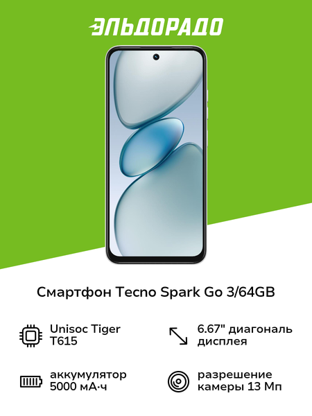 Смартфон Tecno Spark Go Glittery White работает на операционной системе Android 14 HiOS. В основе модели - восьмиядерный процессор Unisoc Tiger T615 частотой 1,8 ГГц и 3 Гб оперативной памяти. • 64 Гб флеш-памяти Предназначена для установки приложений и хранения фото, видео, документов и прочего контента. Хранилище может быть увеличено за счет карты памяти объемом до 1 Тб. • Сканер отпечатка пальца Размещен на боковой грани, обеспечивает быструю авторизацию владельца и защиту данных от посторонних лиц. • Безрамочный IPS-экран диагональю 6,67 дюйма Обладает разрешением 720x1600 пикселей и демонстрирует яркое и детализированное изображение с реалистичной цветопередачей. Поддерживается расширенный динамический диапазон HDR. За передачу звука отвечают двойные стереодинамики. Основная камера разрешением 13 Мп снабжена яркой вспышкой, которая поможет добиться четких снимков даже в темное время суток. Используется AI для обработки изображений. Фронтальная камера на 8 Мп также оснащена вспышкой, дает возможность делать селфи и общаться по видеосвязи. Аккумулятор обладает емкостью 5000 мА*ч, интерфейс подключения - USB Type-C. Время автономной работы в режиме разговора достигает 21 часа. Встроен 3,5-миллиметровый разъем для проводных наушников. Корпус сделан из пластика по стандарту IP54.
