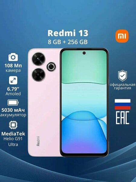 Redmi 13 - это смартфон от известного бренда Xiaomi, который зарекомендовал себя на рынке мобильных устройств благодаря высокому качеству своей продукции. Redmi 13 оснащен 6.79-дюймовым экраном с разрешением 2400x1080 пикселей, что обеспечивает четкое и яркое изображение. Частота обновления экрана составляет 90 Гц, что делает взаимодействие с устройством более плавным и комфортным. Смартфон поддерживает стандарты связи 2G, 3G и 4G (LTE), что позволяет использовать его в разных условиях и обеспечивает стабильное подключение к интернету. Redmi 13 оснащен двойной камерой с разрешением 108 МП и 2 МП, что позволяет делать качественные фотографии и видео. Также смартфон имеет фронтальную камеру на 13 МП для селфи и видеозвонков. Смартфон имеет аккумулятор емкостью 5030 мА⋅ч, что обеспечивает длительное время работы устройства. Redmi 13 имеет степень защиты IP53, что обеспечивает защиту от пыли и брызг. Смартфон работает на операционной системе Android, что предоставляет доступ к широкому выбору приложений и игр.